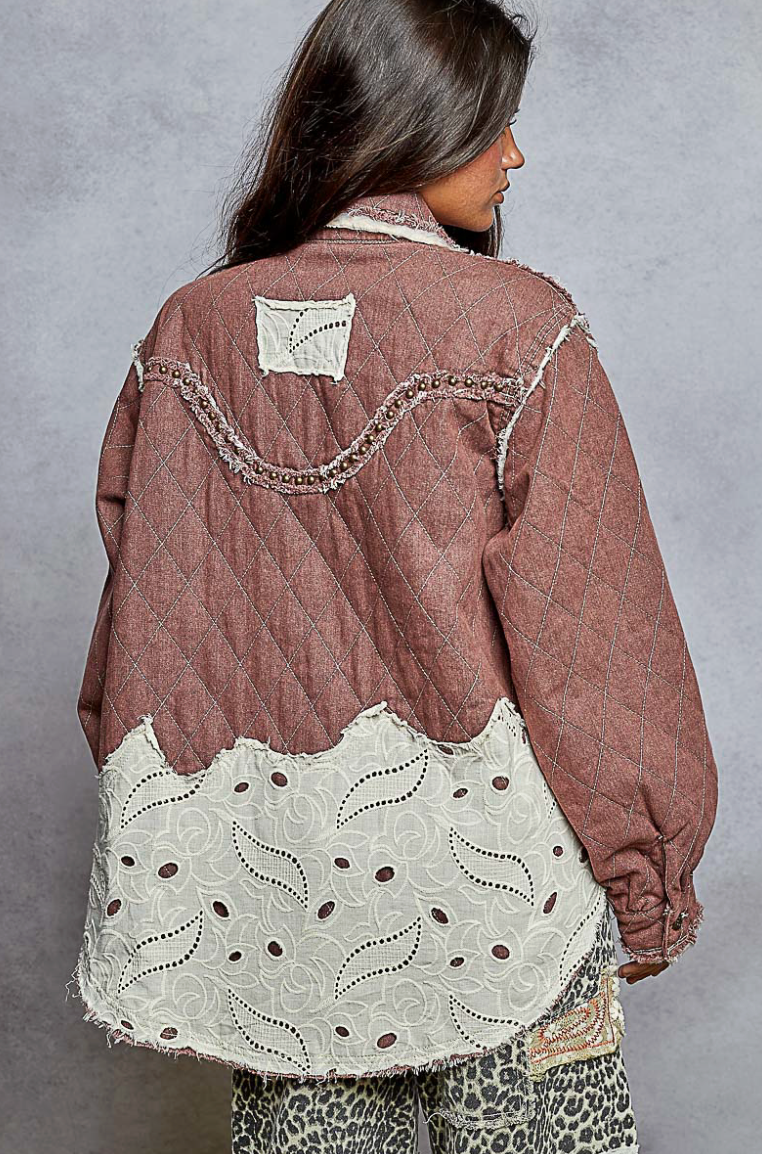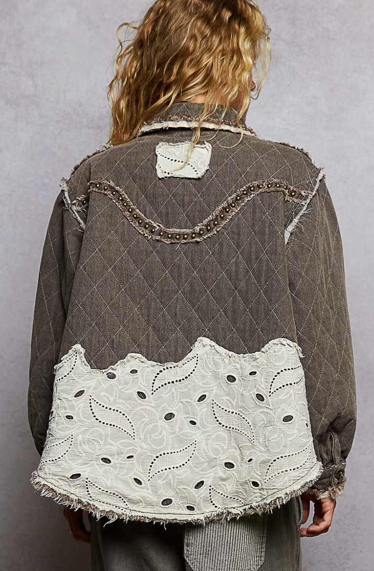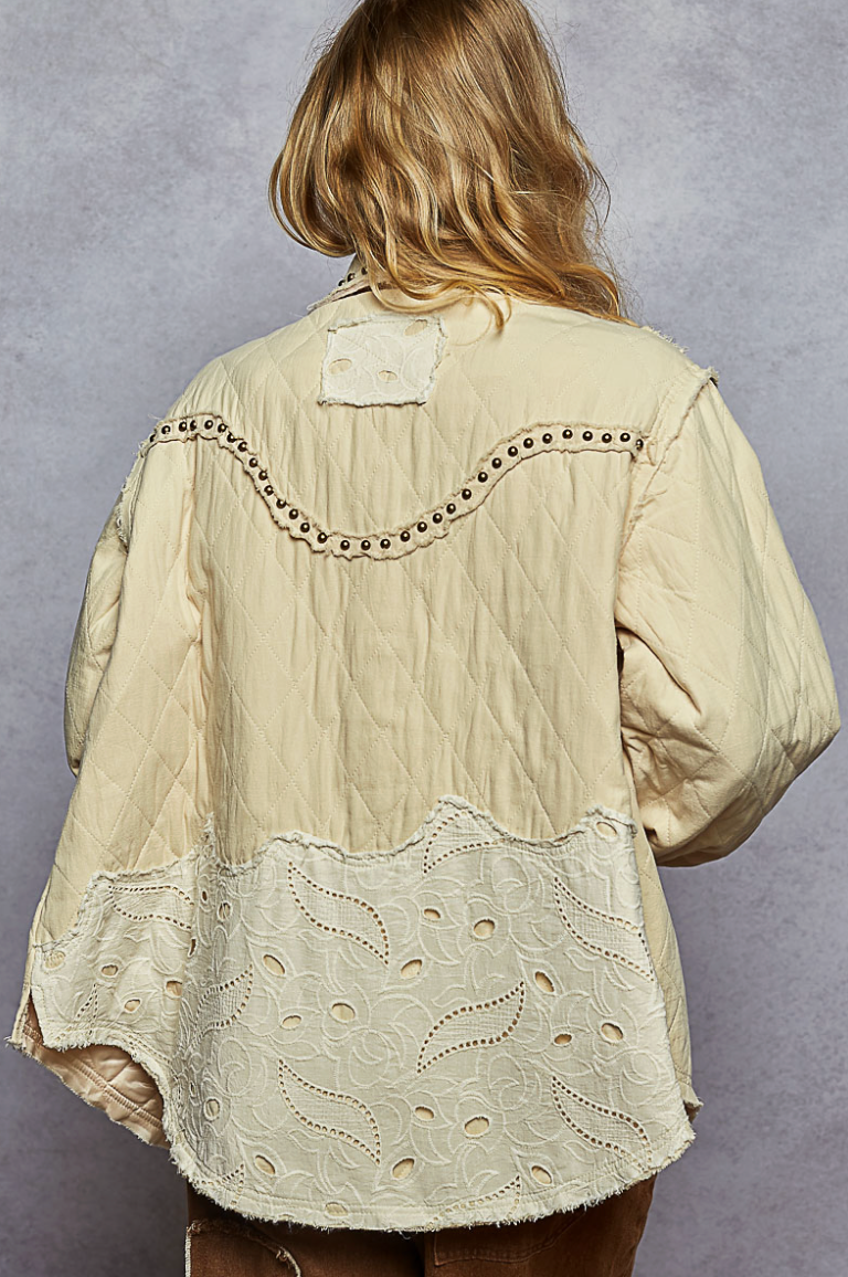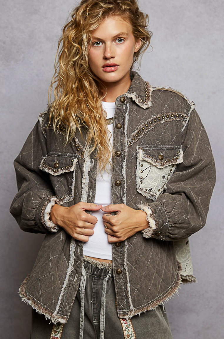 Designed in long sleeve roomy fit shirt jacket in quilted twill with a Western-inspired yoke, self-stripe patchwork with studded detailing, an asymmetrical overlay lace panel at back, and an accented novelty button closure.