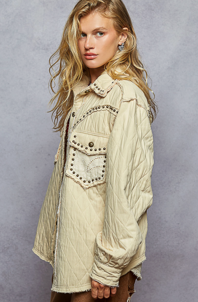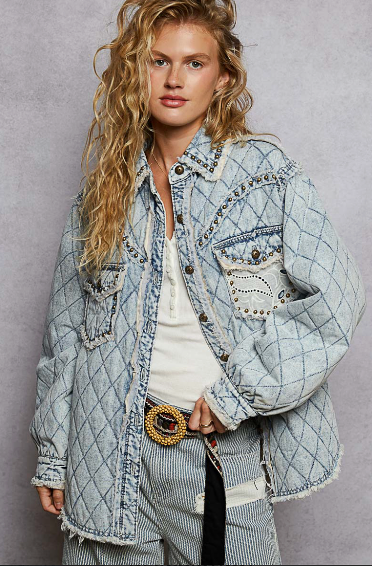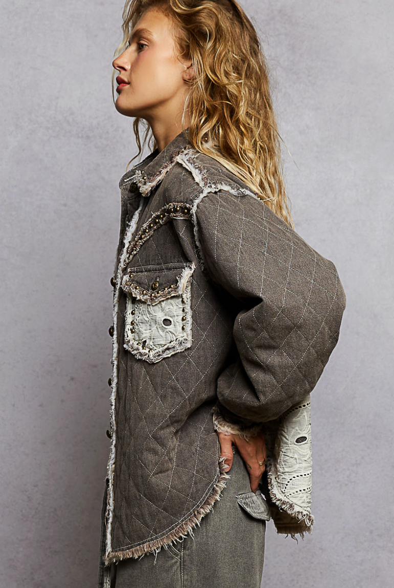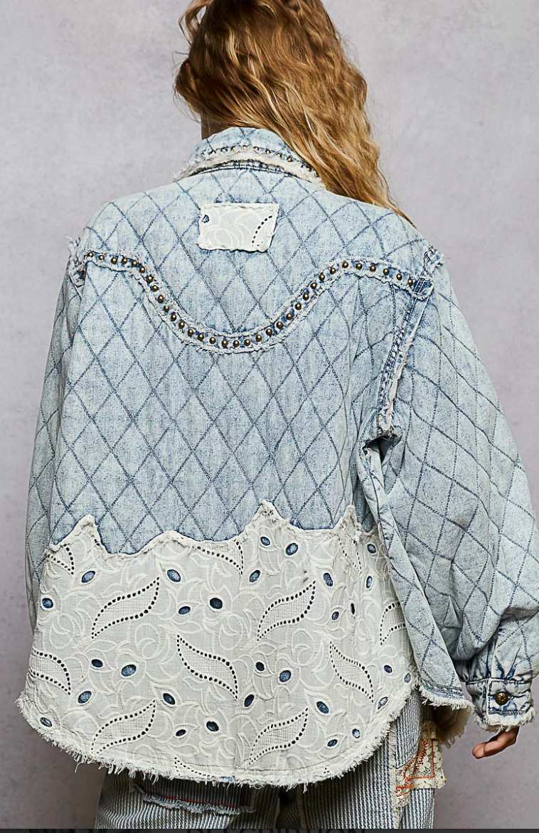 Designed in long sleeve roomy fit shirt jacket in quilted twill with a Western-inspired yoke, self-stripe patchwork with studded detailing, an asymmetrical overlay lace panel at back, and an accented novelty button closure.
