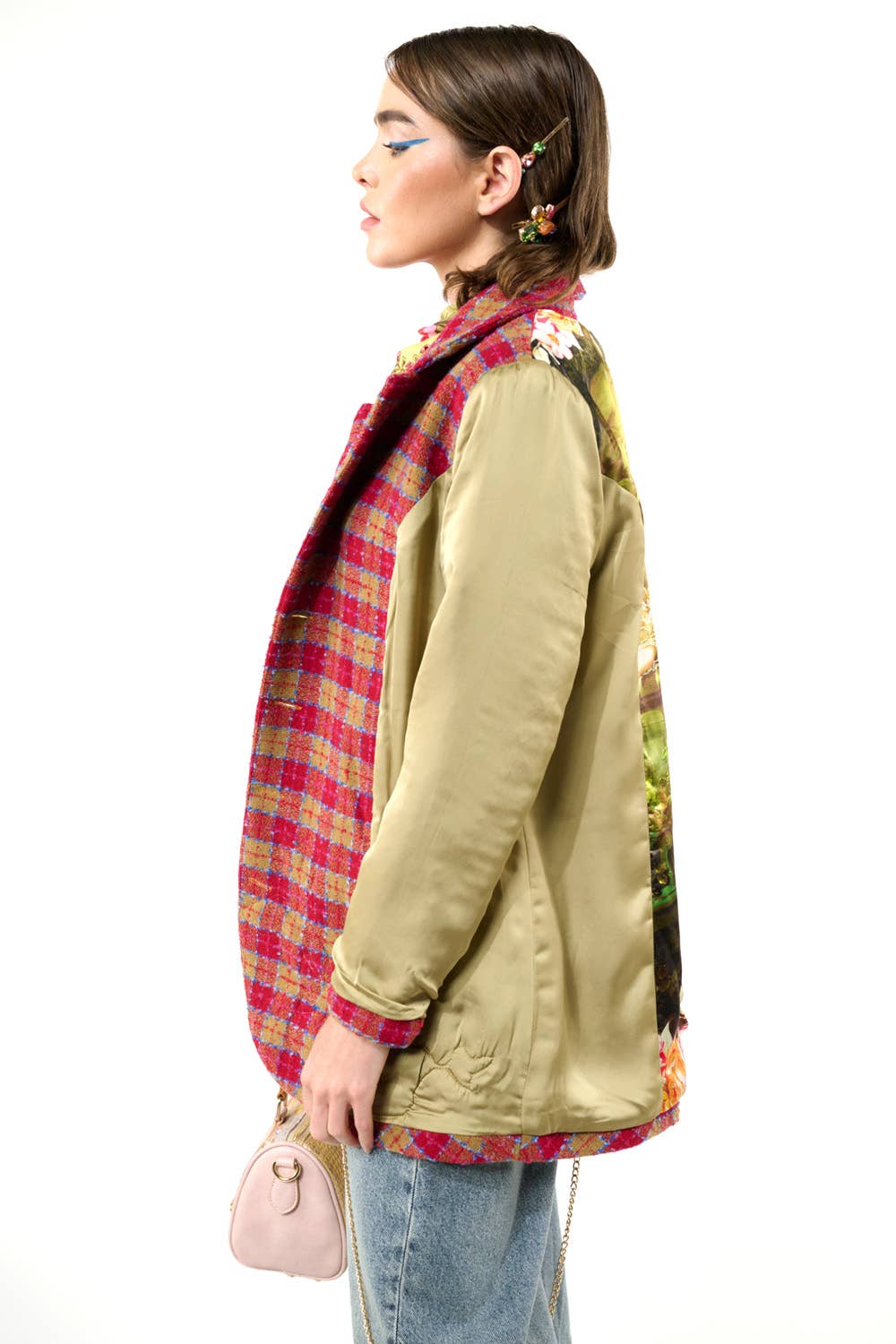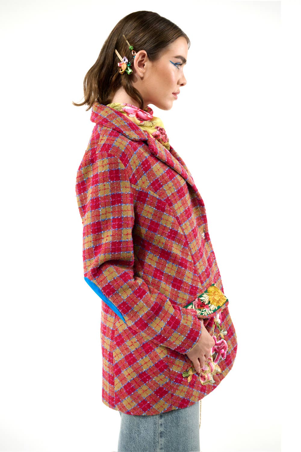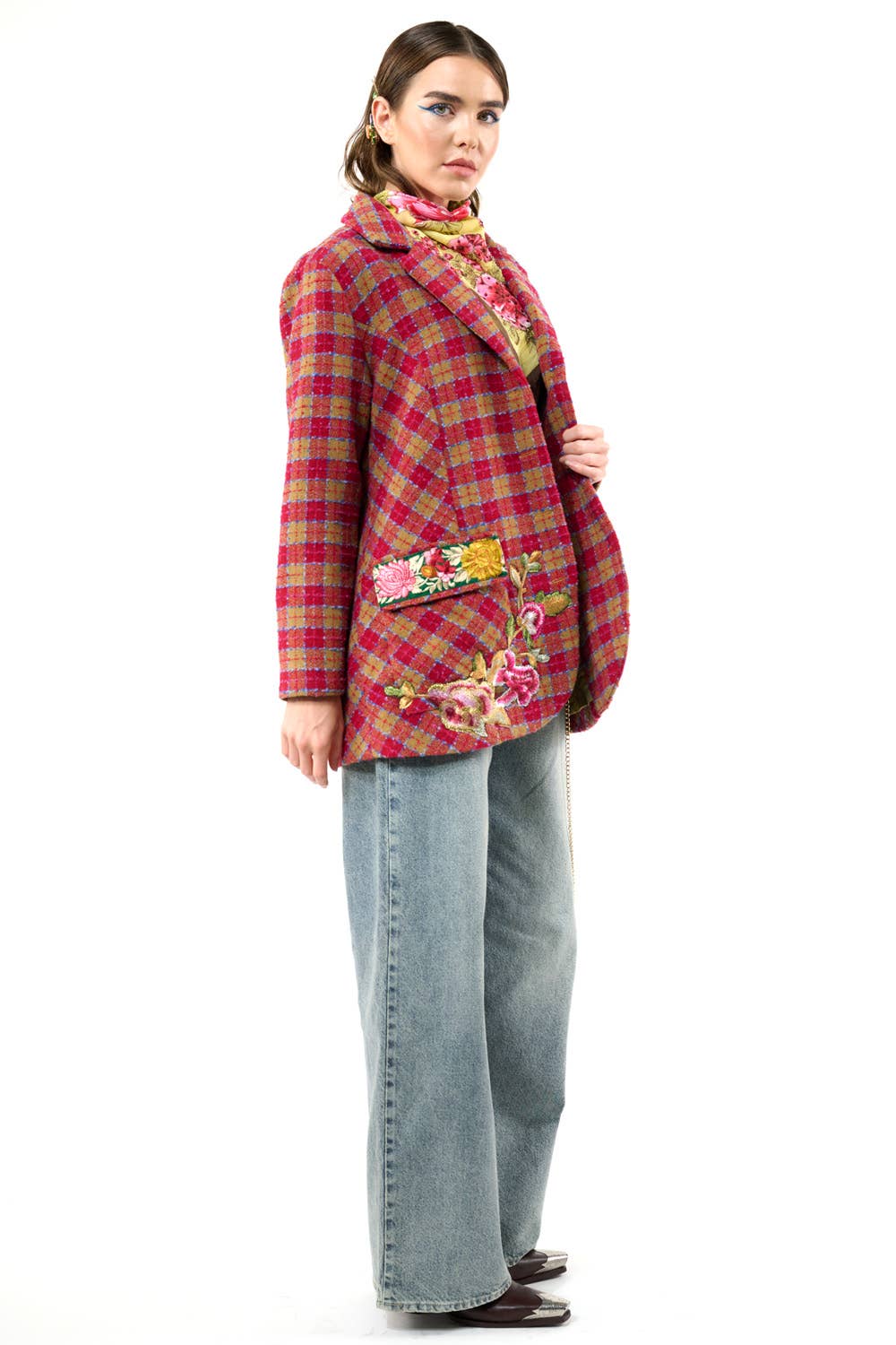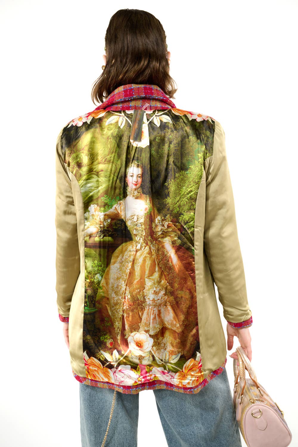 * Boucle button-up embellished blazer, front closure with crystal buttons, 1 upper front patch pocket, 2 lower front flap pockets (flaps with embroidered trims), right front hem with embroidered patch, 2 contrast elbow patches, center back lining with Francois Boucher Madame De Pompadour print, blazer fully lined with satin fabric