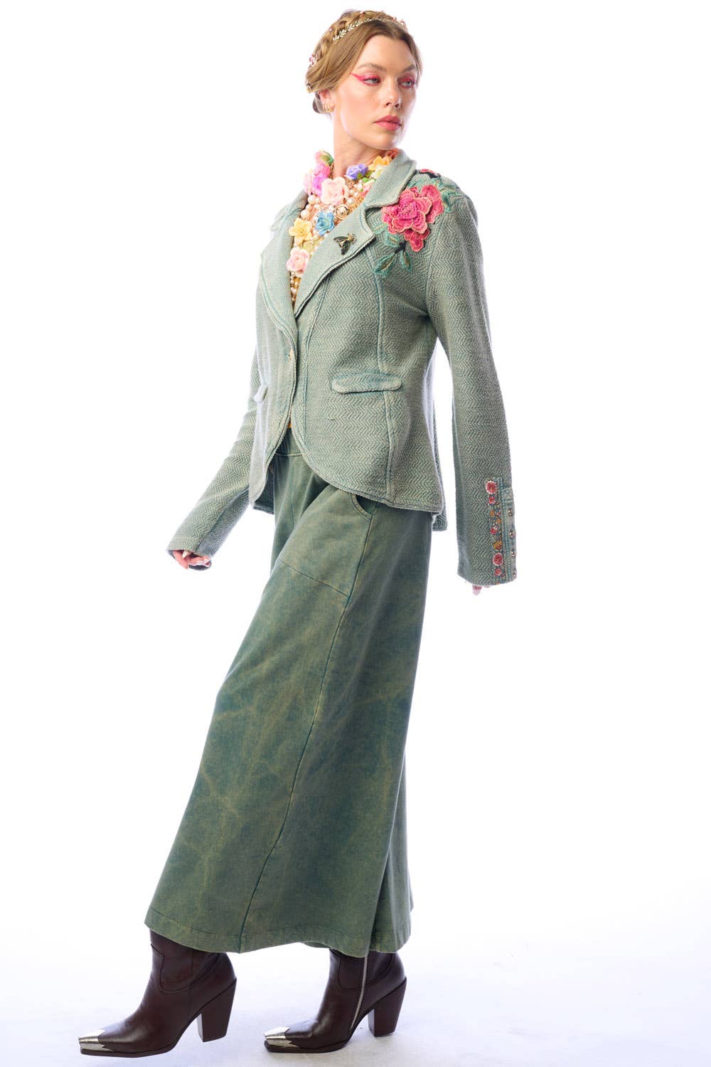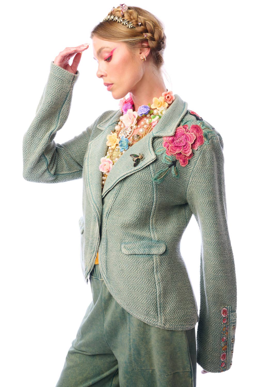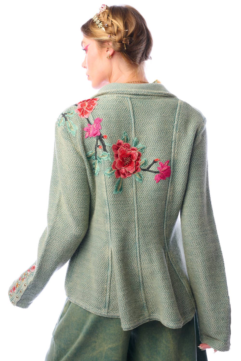 * ED25J625 * Washed French terry button-up blazer, embroidered trim sewn on the sleeves, front left floral embroidered on top left side running to the back, 2 front flap pockets, 2 front metallic buttons * Army wash * Hand wash warm with like colors * Line dry * 100% cotton