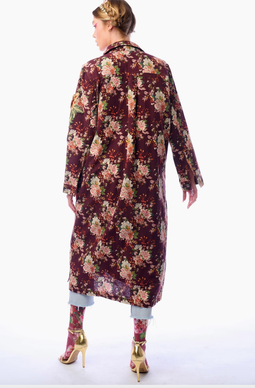 Feel a sweep of burgundy and Ivory florals and soft, expressive charm with the Cara Delvinge Burgundy Coat, offering a romantic outer layer that balances elegance with ease. Made from a cotton-linen blend, this coat features a floral print, an embroidered floral patch on the sleeve, front pockets, a slight high-low hem, and a detachable quilted liner for flexible wear. It adds comfort, texture, and visual character, giving customers a standout outerwear piece that works across seasons and elevates everyday outfits.
