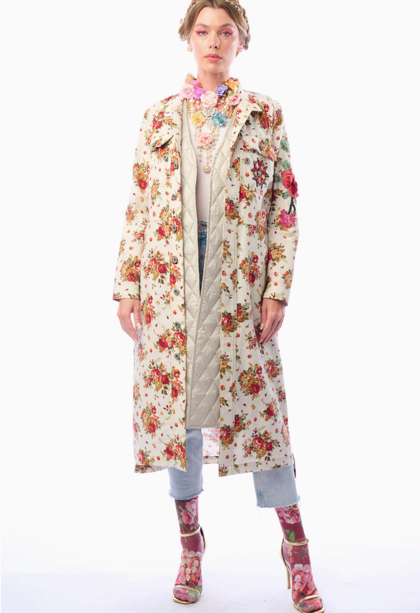 loral print button-up coat with embroidered sleeve patch • Slight high-low hem for flattering movement • Detached quilted liner with sleeveless construction • Two functional front pockets • Soft fabrication for comfortable layering