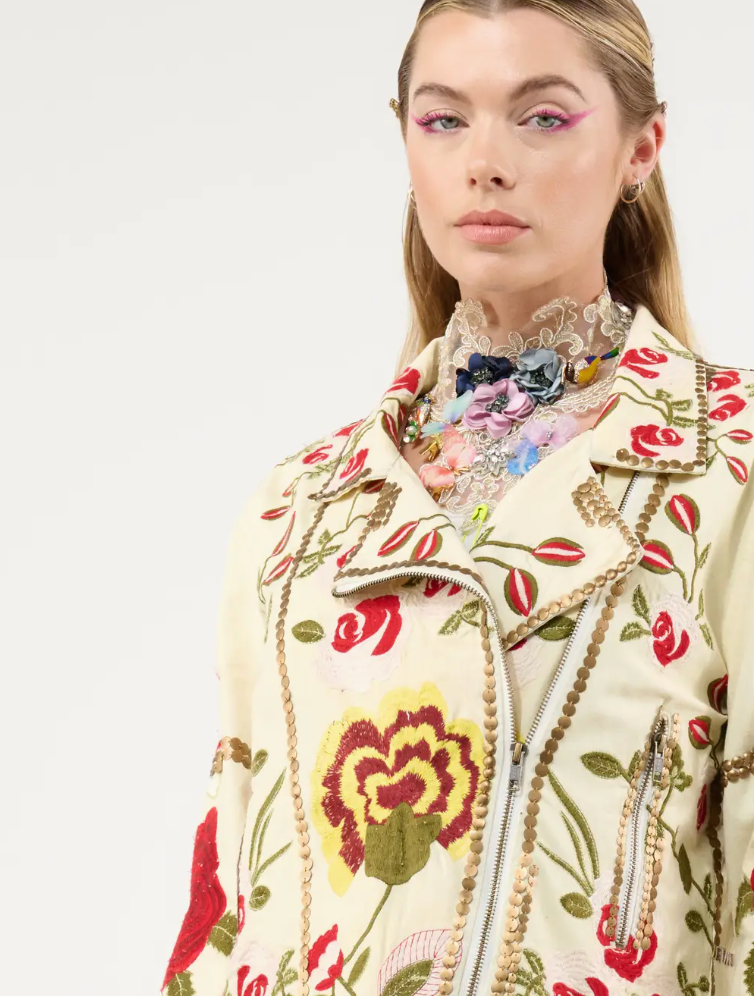 Denim embroidered jacket with hand-stitched antique gold studs, antique gold metallic zippers closure sewn on 2 side pockets and front, jacket fully lined with satin fabric * Ivory * Dry clean only * 100% cotton * Model wears size S. * Info of model: height: 5'8", bust 32", waist 24", hip 33" * Design in Los Angeles, CA