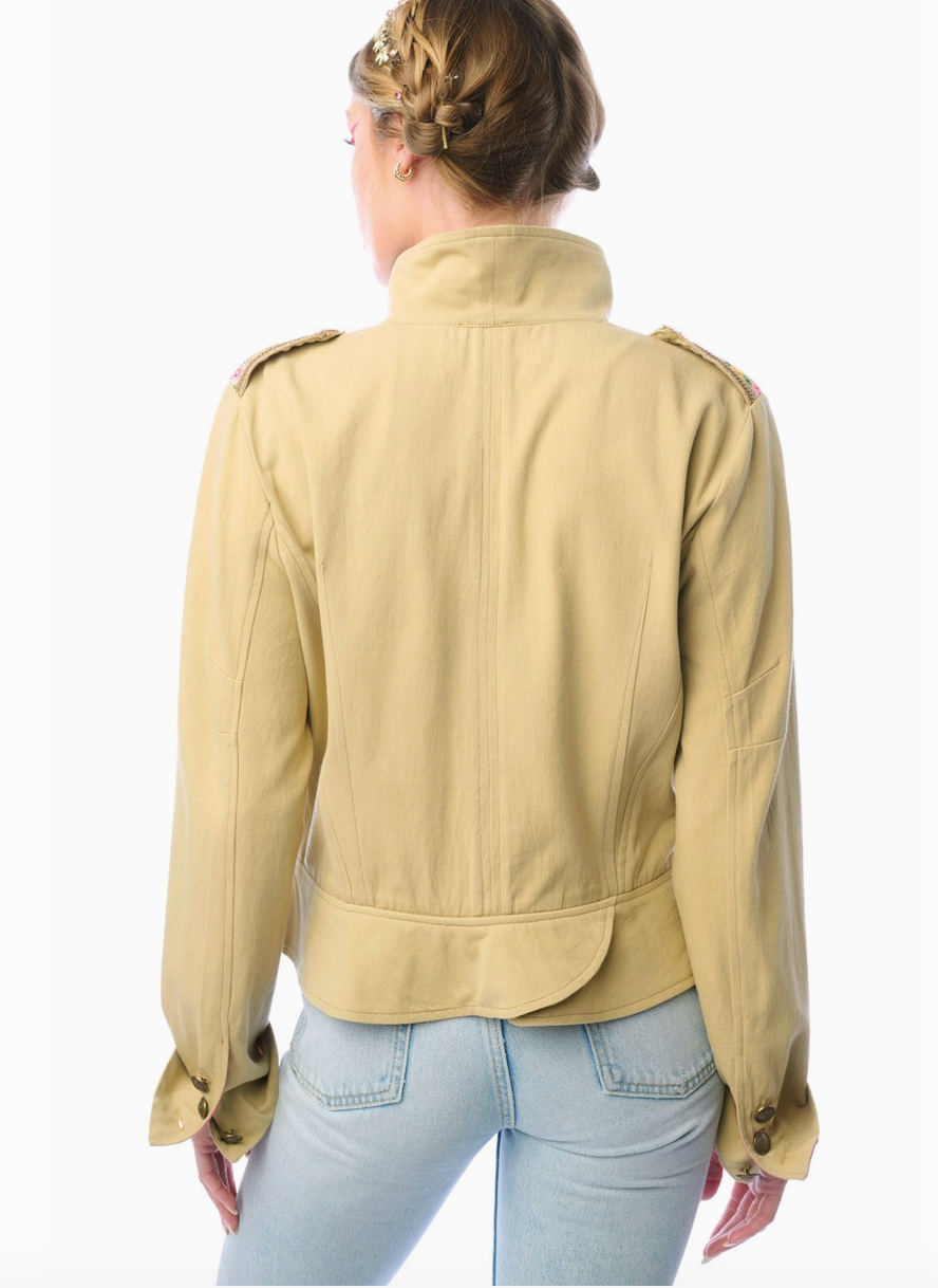 * Button-up jacket with embroidered floral trim on the shoulder, 2 front flap pockets, brooches on left pocket * Olive * Hand wash warm with like colors * Line dry * 100% cotton